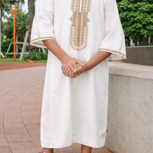 Cette gandoura blanche (blanc cassé) est le symbole de la pureté et de la tradition. Dotée de magnifiques broderies beige sur l’encolure et les manches, elle offre un style raffiné tout en garantissant un confort absolu. Légère et respirante, elle est parfaitement adaptée aux températures de La Réunion. Idéale pour les jours de prière ou les célébrations, cette gandoura s’impose comme un incontournable pour un look à la fois distingué et intemporel.
