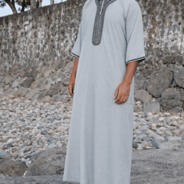 Gandoura gris clair avec broderies détaillées, parfaite pour un style sobre et distingué, adaptée à toutes les occasions.